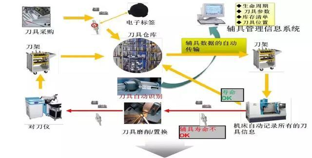 刀具管控的目的是實現對刀具全生命周期信息管理,及時的了解刀具的使用和庫存狀態和位置。在刀具采購入庫前,為刀具加裝電子標簽,作為刀具的唯一身份識別信息。在刀具的調度和使用過程中,通過及時采集刀具的信息,能在系統中清楚的了解刀具是否已經上刀,具體對應的機床以及使用的周期和時長等。通過及時跟蹤刀具位置狀態、使用狀態,企業能及時的了解刀具磨損情況并進行更換,保證刀具的使用安全。